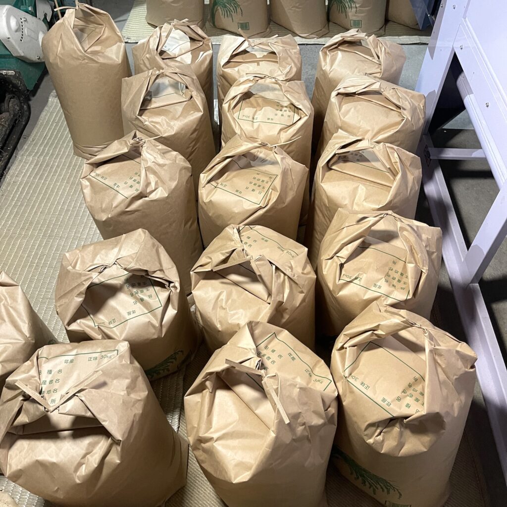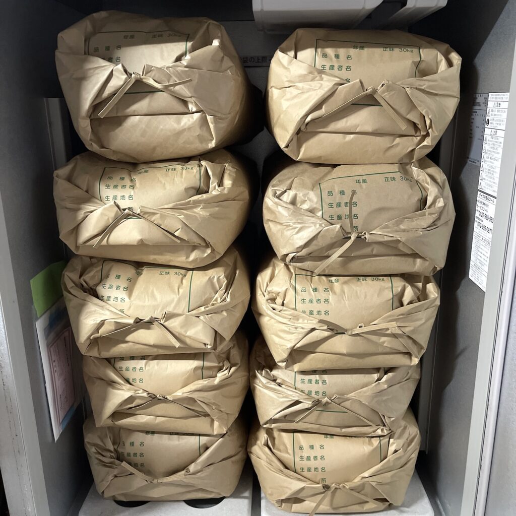 収穫・加工後のお米は玄米の状態で30kg単位で紙袋に詰め、外気に触れないよう保湿と低温管理を徹底しています。特に白米のご注文時は、可能な限り出荷の間際にのみ必要量だけ精米してお届けすることで、最高の新鮮さを味わってもらえるよう努めております。